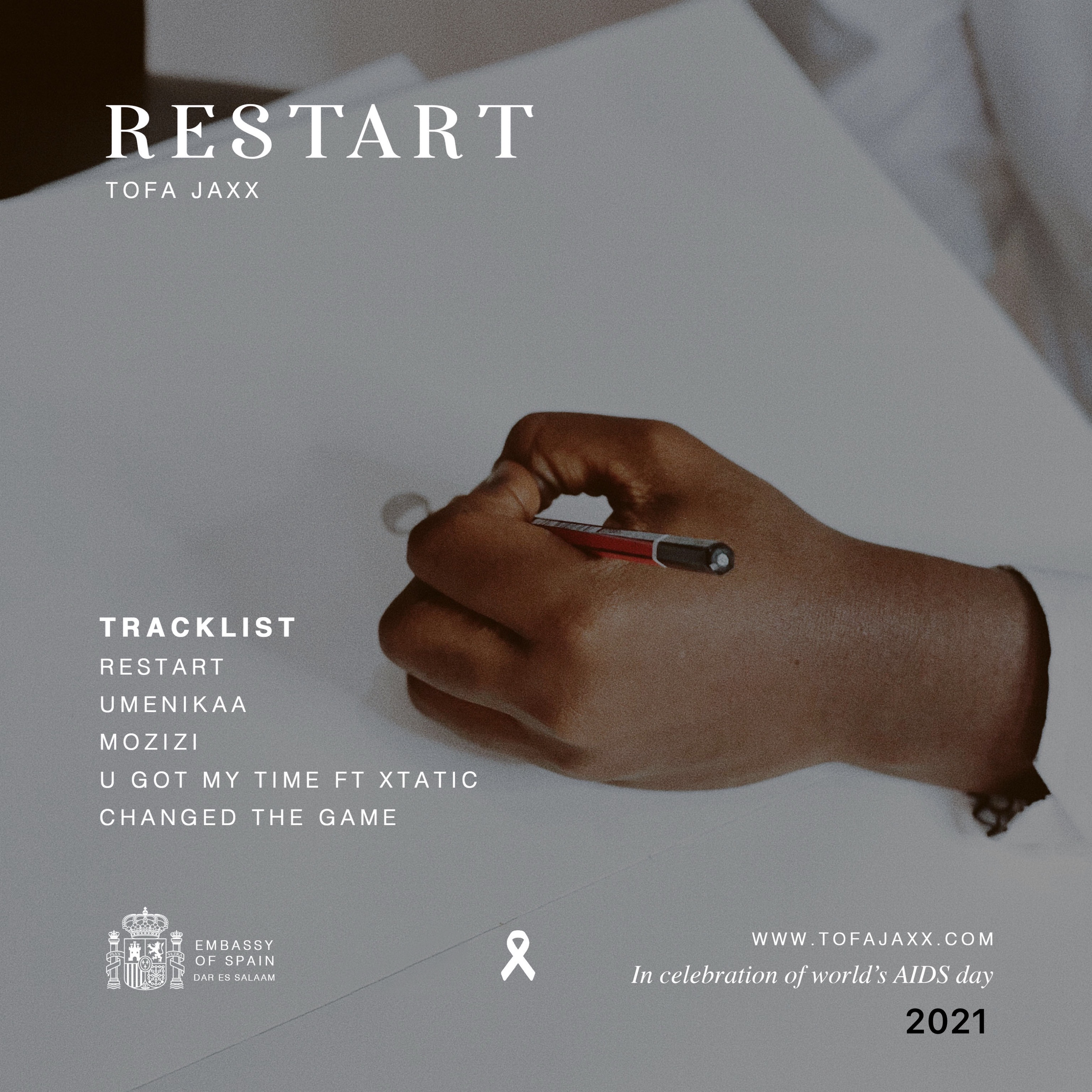 In light of “World Aids Day'' which will be on the same day as “Restart” release. Tofa has partnered with the Spanish Embassy Dar es Salaam to sell 100 limited physical cd copies of Tofa’s music released in 2021 and donate all proceeds from the cd sale to a HIV/AIDs institution in Dar Es Salaam.